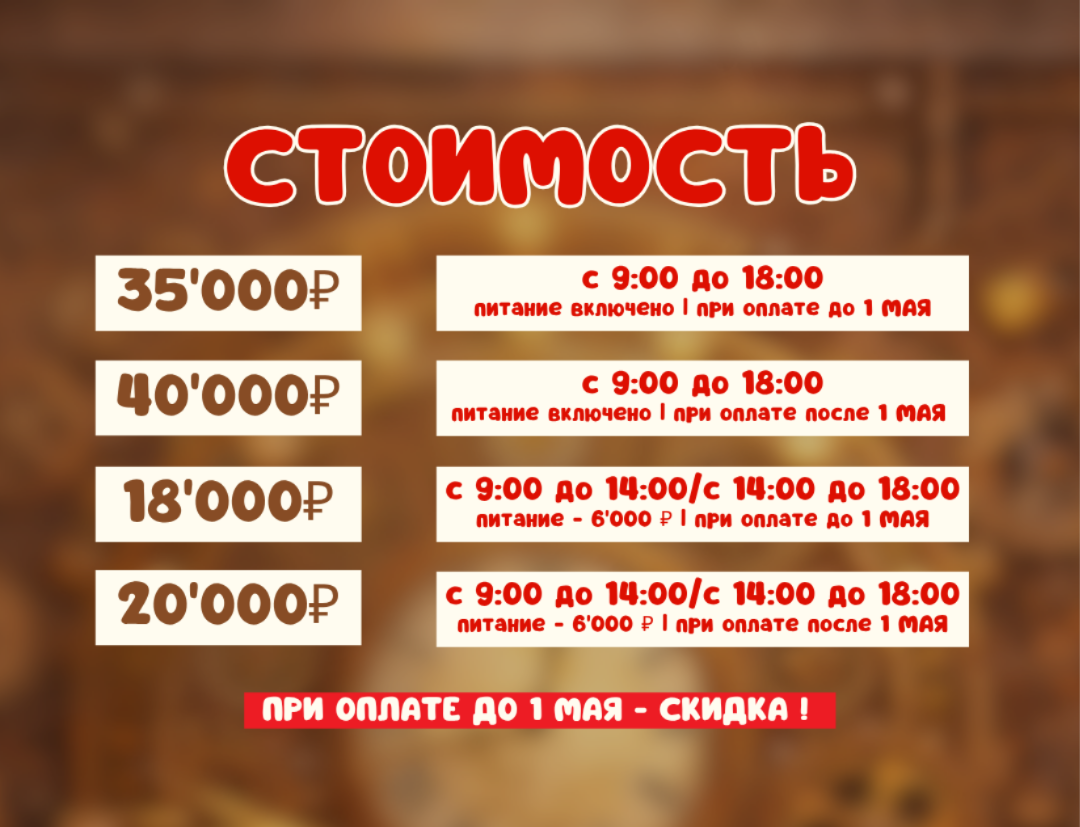 - с 10:00 до 18:00 (с питанием) - 35'000₽ (при оплате до 1 мая) / 40'000₽ (при оплате после 1 мая)
