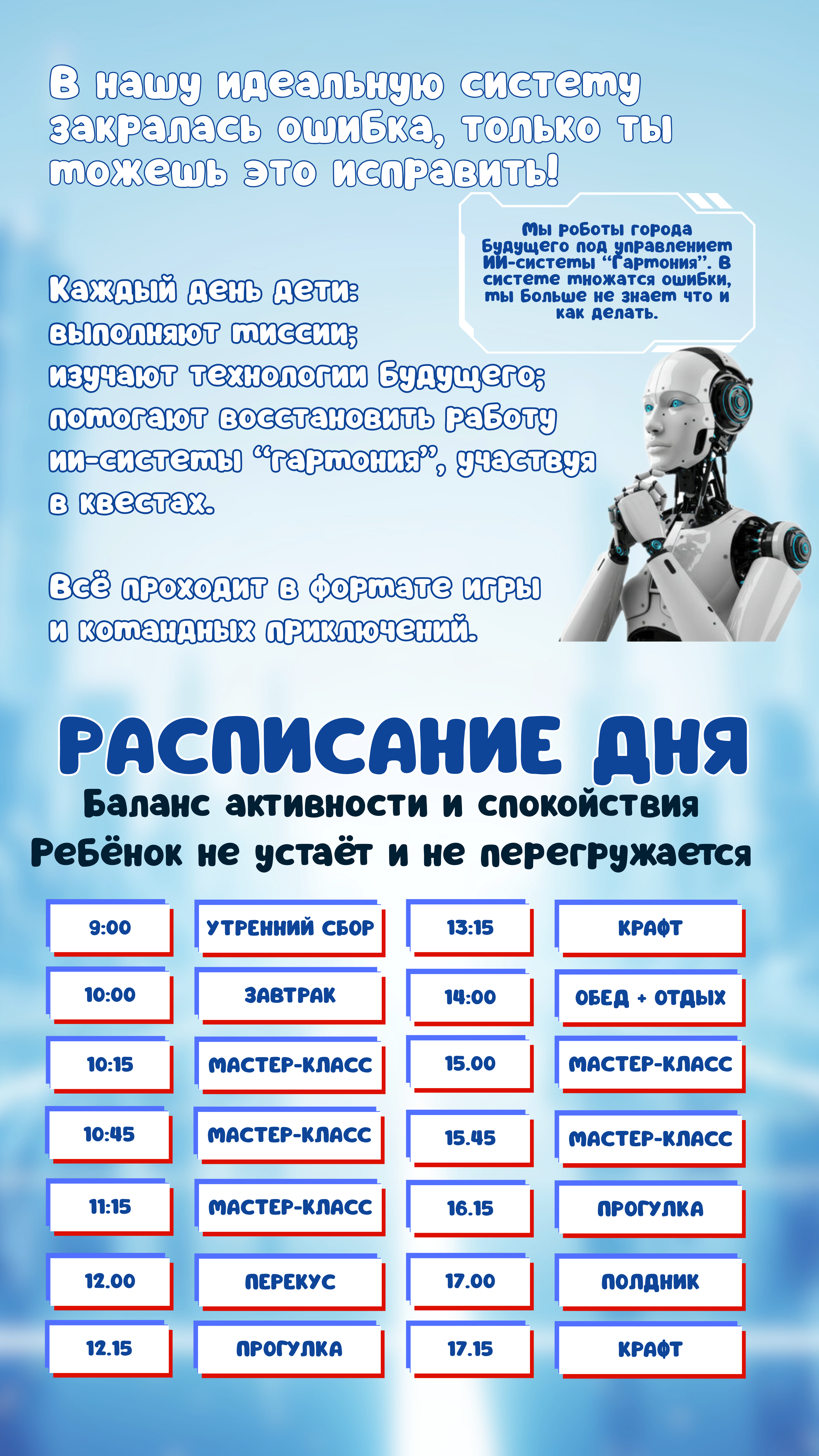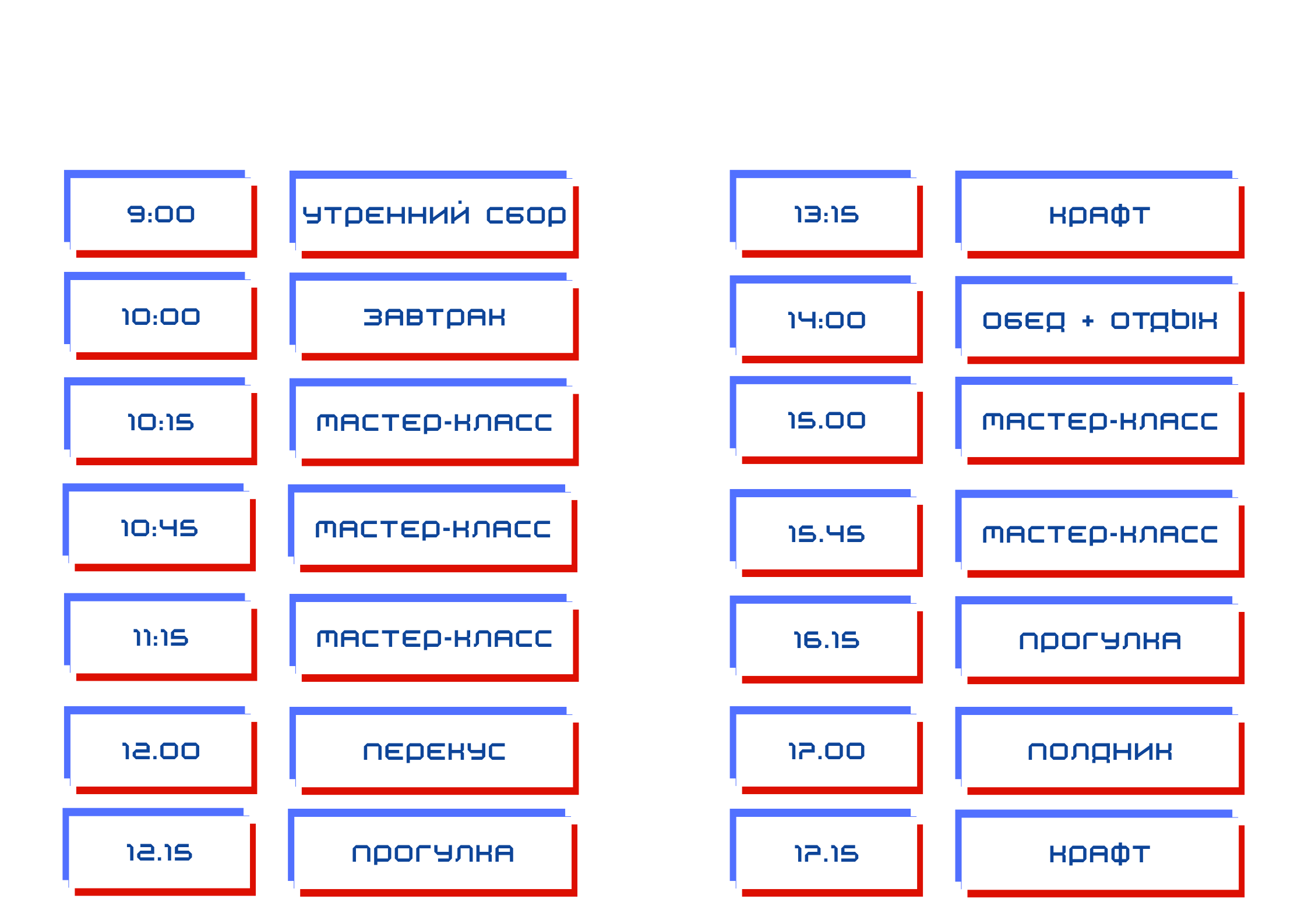 - c 9:00 до 14:00/с 14:00 до 18:00 (питание оплачивается отдельно)