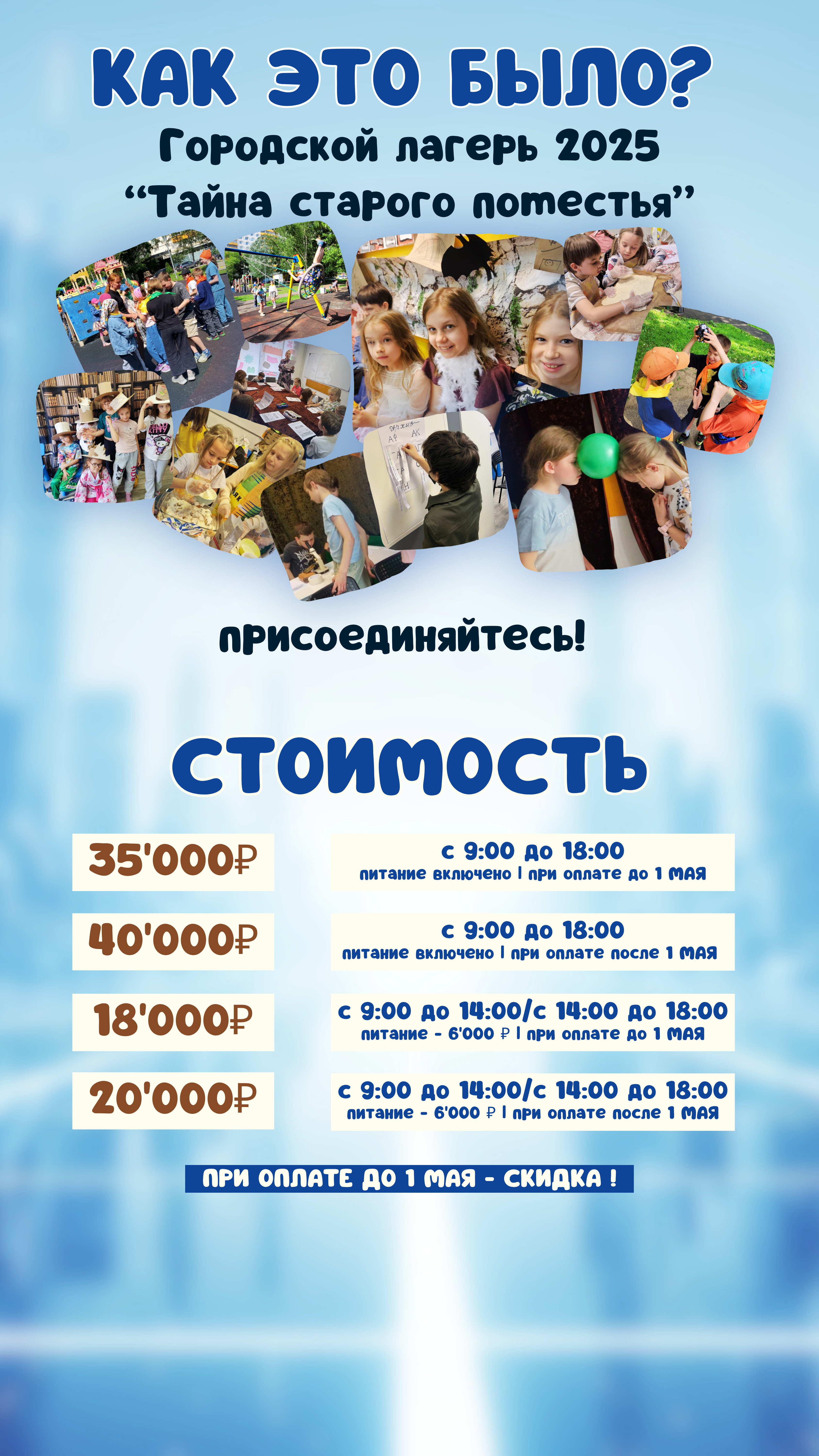 - с 10:00 до 18:00 (с питанием) - 35'000₽ (при оплате до 1 мая) / 40'000₽ (при оплате после 1 мая)